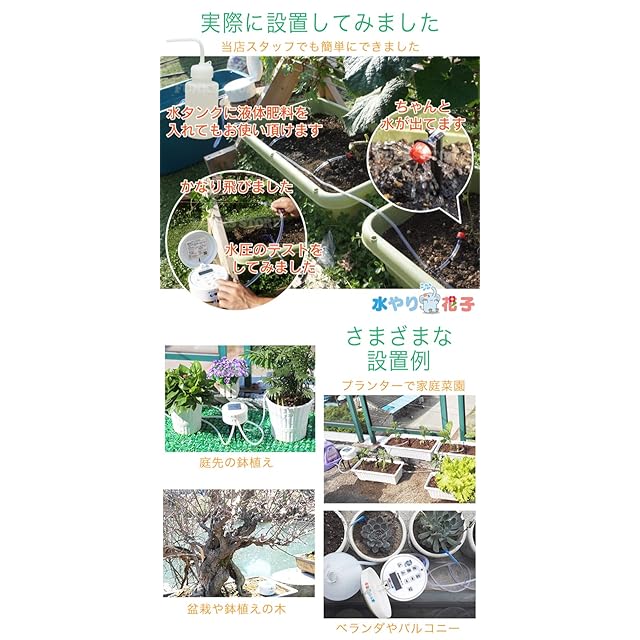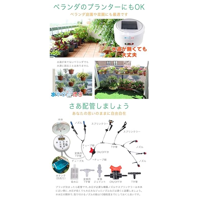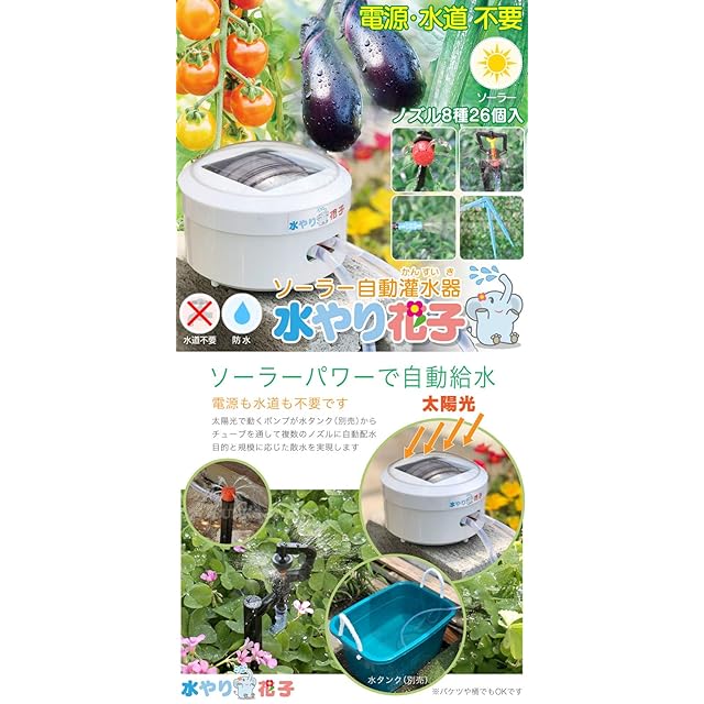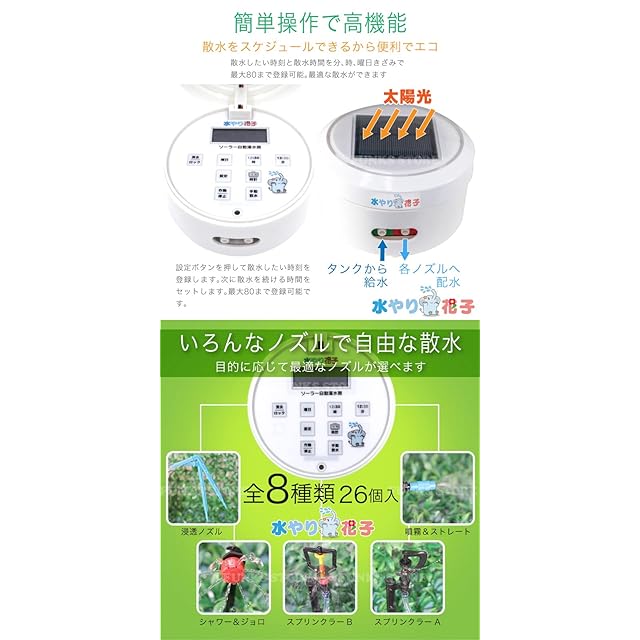 <b>ソーラーで散水<br> 自動水やり(灌水器・潅水器)</b><br> 電源・水道 不要な新世代の水やり器<br> ノズルは全8種類26個入<br> <br> <b>ソーラーパワーで自動給水</b><br> 電源も水道も不要です。 太陽光で動くポンプが水タンク(別売)から チューブを通して複数のノズルに自動配水。 目的と規模に応じた散水を実現します。<br> <br> <b>簡単操作で高機能</b><br> 散水をスケジュールできるから便利でエコ。 散水したい時刻と散水時間を分、時、曜日きざみで最大80まで登録可能。最適な散水ができます。 SETTINGボタンを押して散水したい時刻を登録します。次に散水を続ける時間をセットします。最大80まで登録可能です。<br> <br> <b>いろんなノズルで自由な散水</b><br> 目的に応じて最適なノズルが選べます。 多彩なノズルが付属。 組み合わせを工夫してあなただけの散水を。<br> <br> <b>ベランダのプランターにもOK</b><br> ベランダ庭園や菜園にも最適です。 水道が無くても大丈夫。 水道が来てないベランダでも水源に困ることはありません。<br> <br> <b>さあ配管しましょう</b><br> あなたの思いのままに自由自在。 プランが決まったら配管です。水圧が必要な噴霧ノズルやスプリンクラーは本体に近い側に、水圧が低くても大丈夫なジョロノズルなどは遠くに設置しましょう。<br> ※水圧の関係で、取り付けるノズルの数は10個程度までにしておくと良いです。<br> <br> <b>それでは組み立てです</b><br> チューブをカットしてつなぐだけ。 チューブはハサミでカンタンにカットできますので、T字管を組み合わせてプランに合わせてノズルを配置していきましょう。<br> <br> <b>水タンクと本体を設置しよう</b><br> チューブをつなげば完成です。 水タンクはバケツや桶でもOK。 本体用の足を使えば土の上にも固定可能。<br> <br> <b>実際に設置してみました</b><br> 当店スタッフでも簡単にできました。 水圧のテストをしてみました。 ちゃんと水が出てます。 水タンクに液体肥料を入れてもお使い頂けます。<br> <br> <b>さまざまな設置例</b><br> 庭先の鉢植え。プランターで家庭菜園。盆栽や鉢植えの木。ベランダやバルコニー。<br>