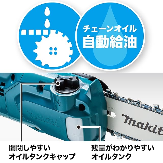 チェーンオイル自動給油。チェーン部への給油を自動で行い、使用時の注油の手間を省きます。チェーンテンション自動調整。レバーを緩めて締め直すだけで、チェーンのテンション調整が自動で行えます。枝用フック付。引っ掛かった枝を引き落とせます。薄刃80TXL仕様。薄い刃幅で切断抵抗を大幅低減。鋭い喰いつきで快速切断。ゲージ厚:1.1mm。ピッチ:0.325”。防滴・防じん「アプト」。過酷な作業環境から本機を守り抜く。※注意:水や粉じんによって故障しないことをするものではありません。ロックオフボタン付。
