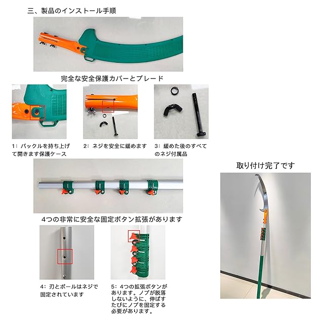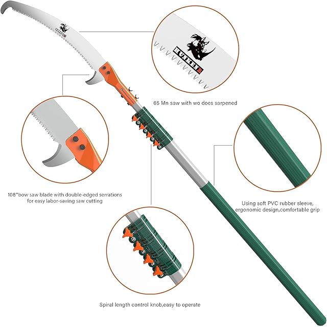 材質:このポールソーブレードの材質は65Mnで、非常に鋭利で、小さな枝を簡単に切ることができます。また、ハンドルの材質はアルミニウム合金で、握りやすいです。