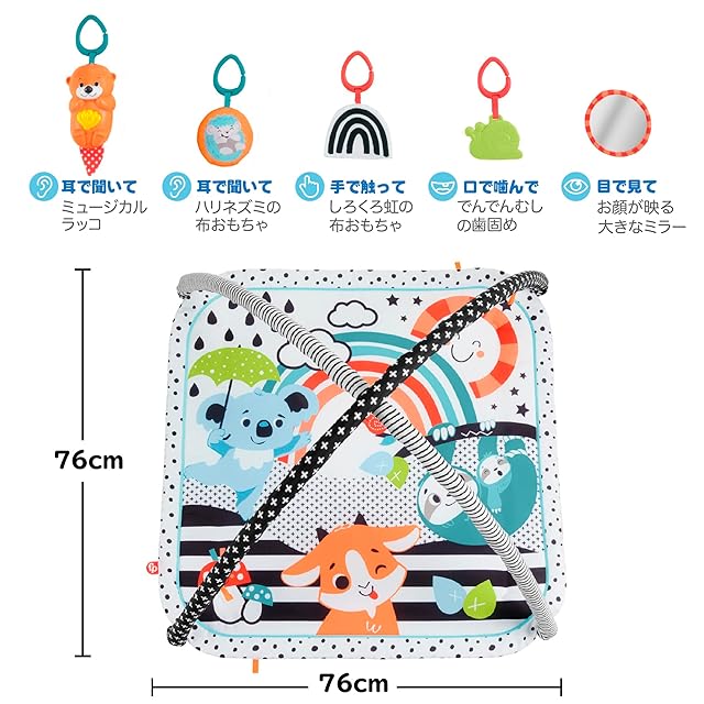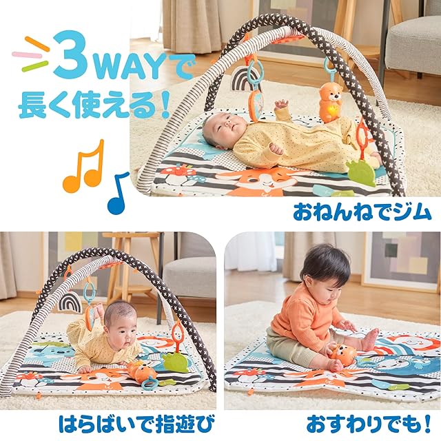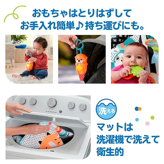 【内容】感覚の刺激が、遊びの原点!お誕生してすぐから、たくさんの感覚刺激を与えてくれるおもちゃが揃ったベビージム!おねんねやはらばい時期はもちろん、お出かけ先でもゆかいなどうぶつたちが、いつでも楽しく盛り上げます。 耳で聞いて:およそ15分間のメロディが流れてライトアップするミュージカルラッコ! 目で見て:生まれたばかりのお子さまでも認識しやすいコントラストのはっきりした模様。ミュージカルラッコのライトやお顔が映るミラーも視覚を刺激します。 手で触って:布おもちゃは、ふかふか柔らかい手触り! 口で噛んで:歯の生え始めから使える歯固めで、お口すっきり!