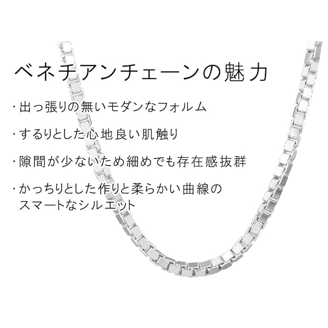 【ベネチアンチェーン】出っ張りの無いモダンなフォルムで、するりとした肌触りが心地良いベネチアンチェーン。隙間が少ないため細めでも存在感は抜群。かっちりとした作りと柔らかい曲線が独特の魅力を持ち、男女問わずお使いいただけるチェーンです。