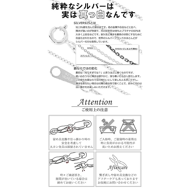 【Silver925素材】シルバーは実は真っ白な金属。SILVER925とは92.5%銀を含んだ銀合金です。他の金属や合金などと比べ、輝きが強いのが特徴で光の反射率は98%とプラチナの60%を大きく上回るほどです。耐久性と輝きの良い状態にするために合金化されたもので、世界のシルバーブランドのほとんどがSILVER925を使用しています。