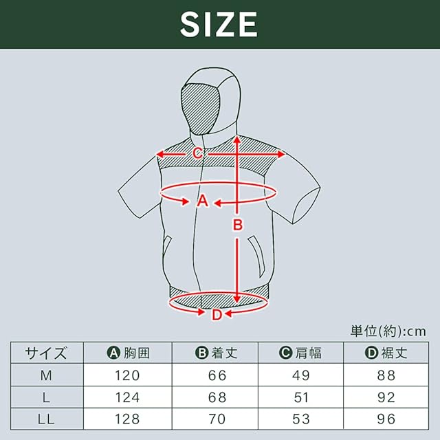 <ウェア>商品サイズ(cm):LL胸囲約128、着丈約70、肩幅約53、裄丈約52、裾廻約96