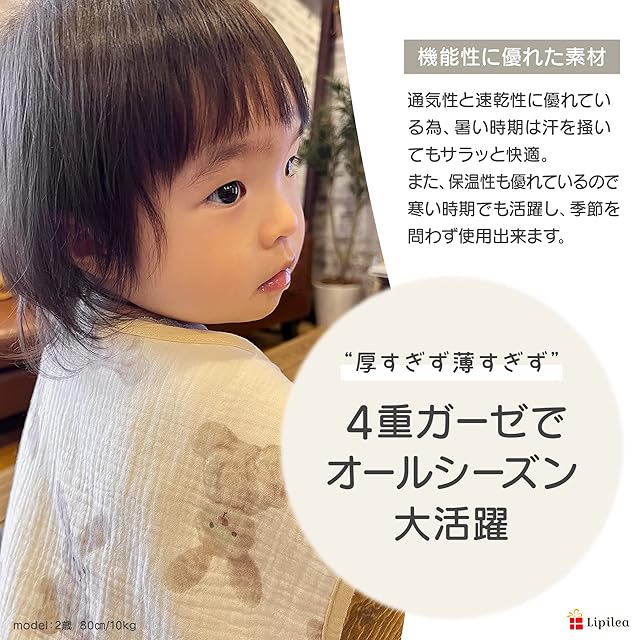 【洗う度に風合いが増すふわっとやわらかガーゼ】 敏感肌のお子様も安心◎毎日着たくなる、柔らかく肌触りの良い綿100%素材を使用しています。生地は伸縮加工で、凸凹部分にたっぷり空気を含むと、ふわふわの触りに♪また、4重ガーゼ採用したことで、薄すぎたり厚すぎたりせずちょうど良い厚みで、お子様の着心地も抜群です。オールシーズン活躍してくれるスリーパーは、季節に合わせて買い足さなくてもOK!経済的なところもうれしいポイントです。