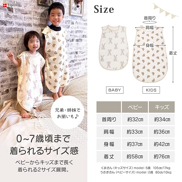 商品仕様】○対象年齢:0ヶ月~36ヶ月 ○サイズ:着丈約58cm、身幅約38cm(洗濯後は着丈約55cm、身幅約36cm) ○適応身長:60~80cm ○素材:綿100% ○ブランド:Lipilea(リピレア)