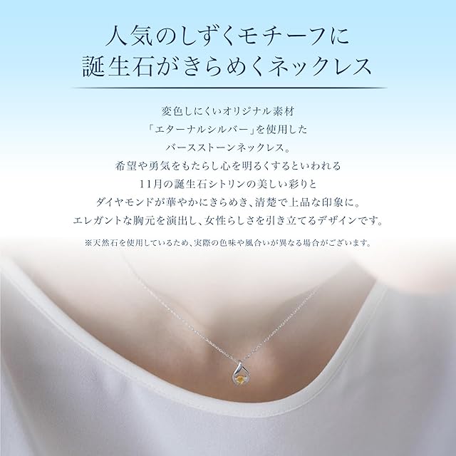 変色しにくいオリジナル素材「エターナルシルバー」を使用したネックレス。人気のしずくモチーフに11月の誕生石のシトリンとダイヤモンドが煌めき、清楚で上品な印象に。ベーシックなデザインながらもほどよい存在感があり、コーディネートのアクセントになるデザインです。※天然石を使用しているため、実際の色味や風合いが異なる場合がございます。