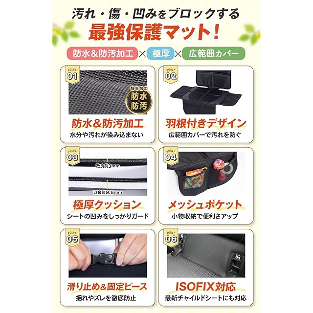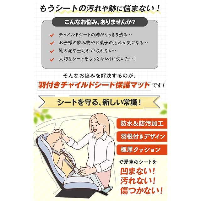 【サイドもガード】羽根付きデザインのチャイルドシート 保護マット なのでシートのサイド・横も汚れからガードできます。横から乗っても大丈夫。食べこぼしもカバーします。