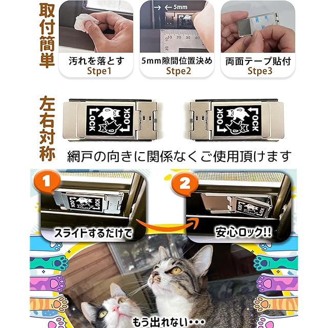 【取付簡単設置はたったの3ステップ】①汚れを落とす ②5mm隙間位置決め ③ 両面テープ貼付。「3 M」VHBシリーズの両面粘着テープを使用。さらに独自の加工で太陽光・熱に強く、剥がした後もテープ跡が残りません。ワンタッチで取付簡単!網戸ロック本体の後ろのテープをはがして窓ストッパーに貼るだけで猫ちゃんが脱走を諦めます。