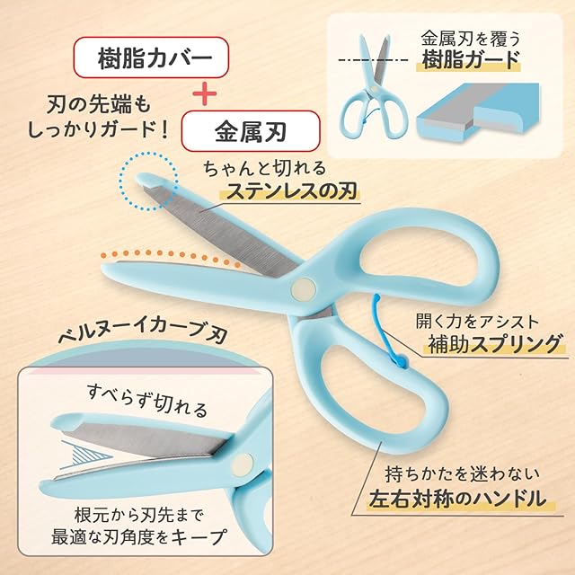 【ベルヌーイカーブ刃】 滑らず切れる & 小さな手でも開きやすい。【樹脂ガード付き】 金属刃を覆って安心安全。刃先端もしっかりガード。