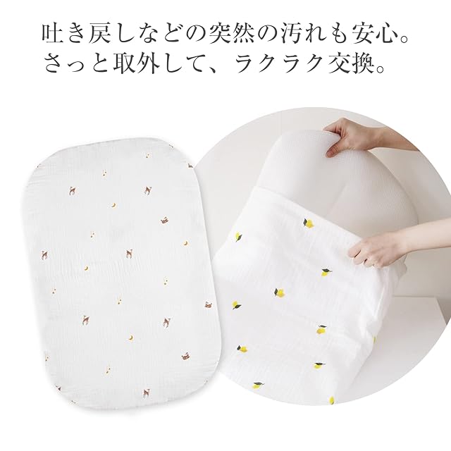 【選べるかわいい種のデザイン】デザインはイブルの優しい風合いとマッチした、かわいいバンビ、きたきつね、レモンの3種類。モチーフを全体に散りばめました。商品名:丸洗いできる イブル抱っこ布団用洗替カバー サイズ:66cm×38cm 素材:綿100%