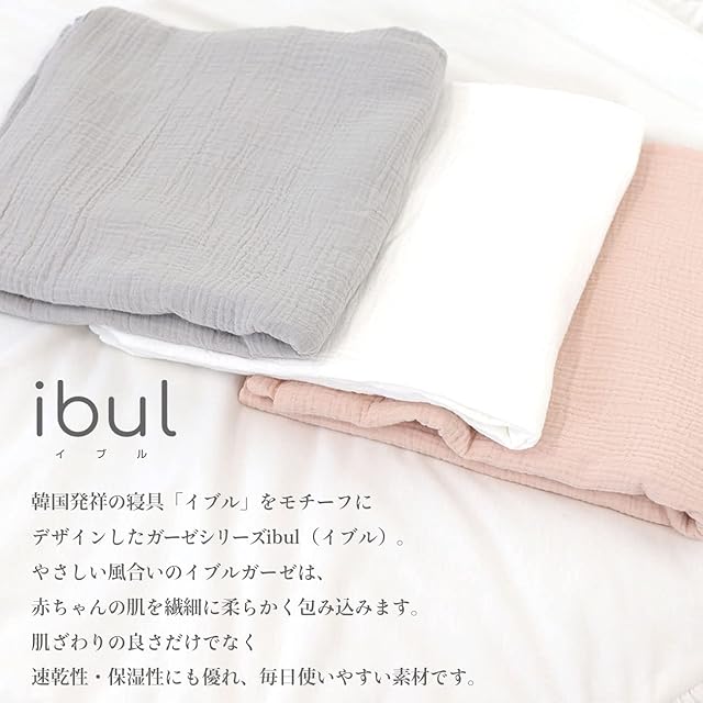 【やさしい風合いのイブルガーゼ】韓国発祥の寝具「イブル」をモチーフにデザインしたガーゼシーリーズ“ibul(イブル)”。イブルの優しい風合いを生かした、やわらかくふんわりとしたガーゼケットです。2重になっている生地は空気を多く含むため保温性に優れ、水分を素早く吸収。さらに速乾性もあり、汗をかきやすい赤ちゃんも快適に使用することができます。
