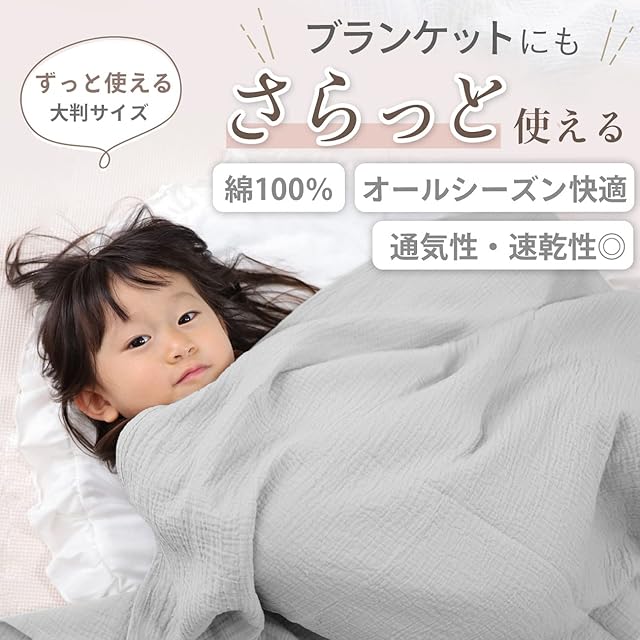 【使い方色々♪正方形サイズ】おくるみだけでなく、ブランケットとしても大活躍。肌寒い日はもちろん、夏のエアコン対策にもぴったりです。大判サイズなので、成長してもずっと使えます♪