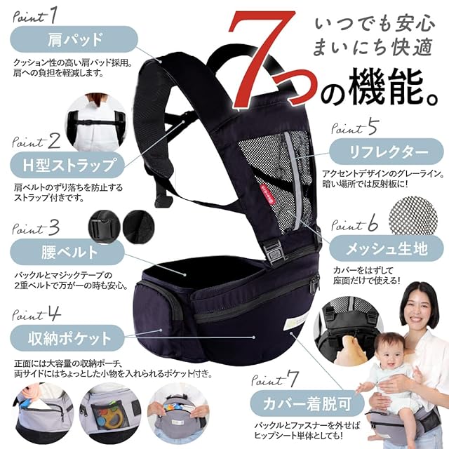 【ママと赤ちゃんに優しい安心&快適構造】《その①安心のバックストラップ仕様》背中側のストラップでしっかり固定され、赤ちゃんが激しく動き回っても安心!《その②腰ベルトと肩のパッドで負担軽減!》肩や腰にかかる力が分散されるので、ママ&パパの負担も少なく快適です♪《その③ヒップシートは上向き30度!》赤ちゃんが座ったときに一番快適で負担を掛けない30度設計になっています♪《その④1年通して使える防寒防暑仕様!》付属のフードとカバーを取り付けることで冬は防寒仕様に!寒さから大切な赤ちゃんを守ります♪春~夏はカバーを外して快適に♪メッシュ仕様になっているのでムレ対策に!赤ちゃんと長時間密着していても通気性に優れているのでムレにくく快適です♪フードも日差しが強い夏などにも取り付けることで日よけになりとっても便利♪