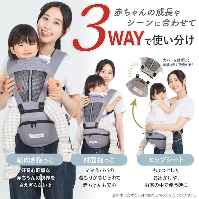 【3WAYの使い道】対面抱っこや前向き抱っこはもちろん、ヒップシートとして使える嬉しい3WAY仕様!成長やシーンに合わせて使えるのでとっても便利♪キャリアとしてもヒップシートとしてもお使い頂けるので、様々なシーンでとっても便利!収納ポケットもついているのでちょっとしたお散歩やおでかけなどに大活躍まちがいなし!「抱っこ!」「降ろして!」のわんぱく赤ちゃんにはヒップシートとして使うことで、いちいち取外す必要がなく快適に♪