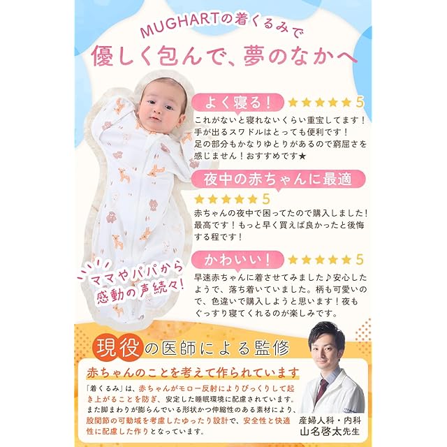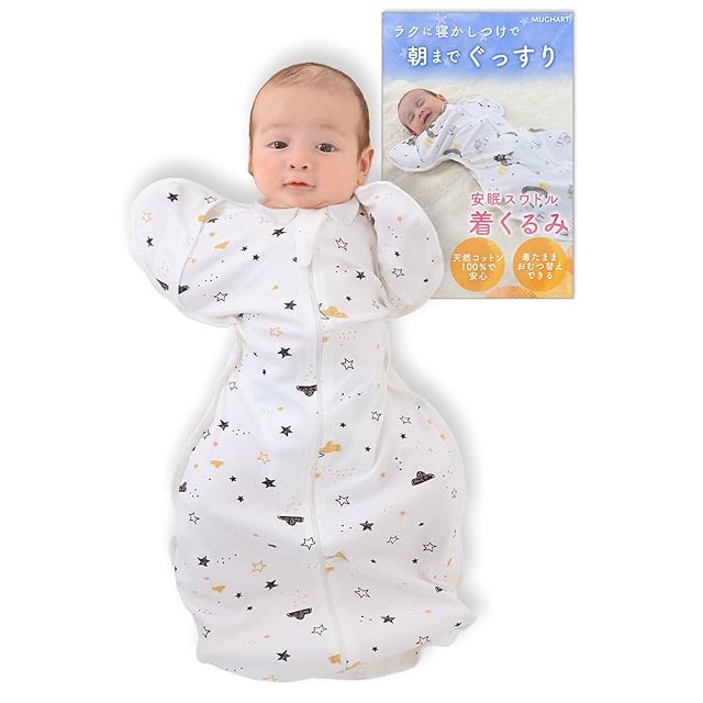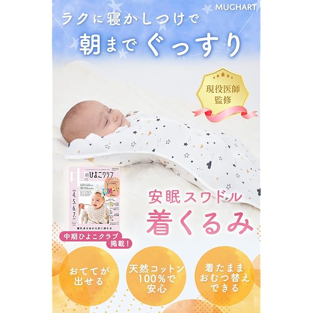 【ひよこクラブ掲載x医師監修】 おくるみ スワドル 手が出せる 新生児【IHDI認証済み】モロー反射を防ぐ マグハート 着くるみ 夜泣き対策 天然コットン100% Mughart (よぞら, Mサイズ) | つむぎ屋