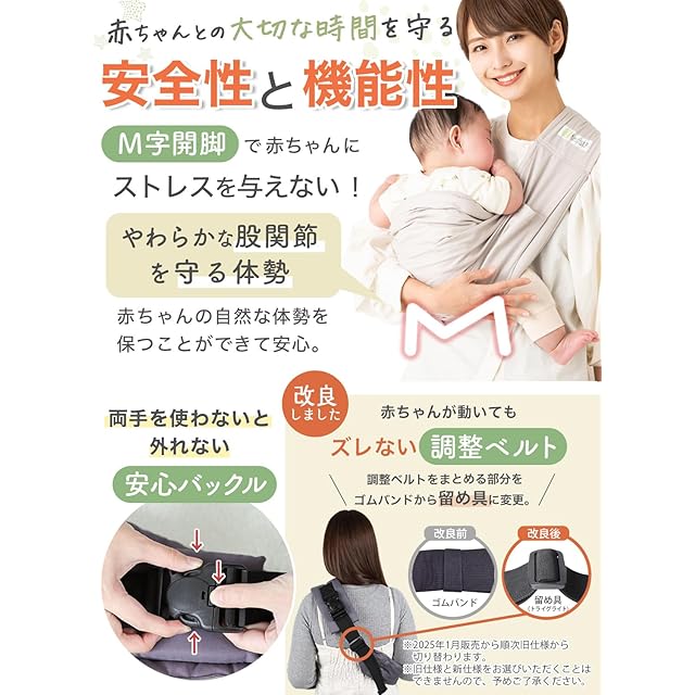 <大切な赤ちゃんに使うものだから安心設計> ・M字開脚で赤ちゃんにストレスを与えない・バックルは安心の2重ロック&ベルトズレ防止設計 <手軽に使えるポイント> ・使う人の身体に合わせて簡単調整!・厚さ2cmの肩パッドで疲れにくい・便利な収納ポケット・丸洗いOKで清潔