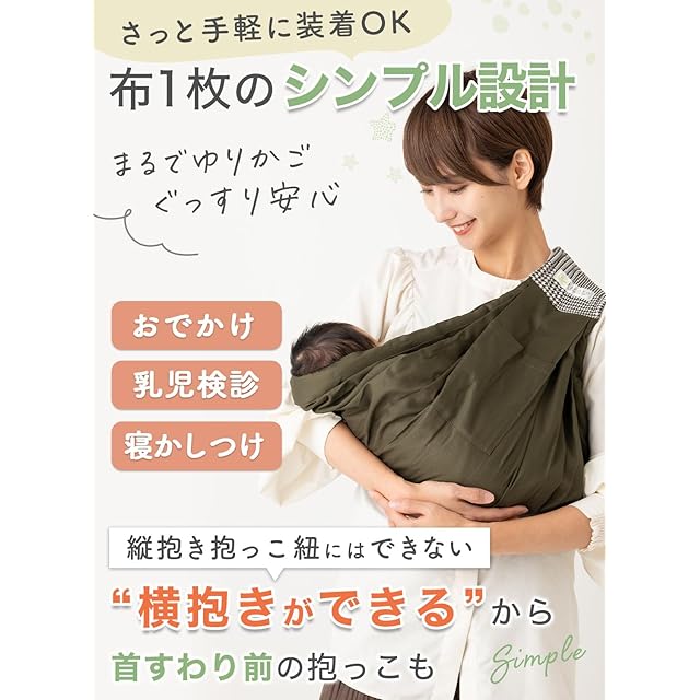 <Point.1 シンプル設計> 片肩だけで支えられる布一枚のシンプル設計。腰ベルトもないのでさっと着脱ができます。ちいさな赤ちゃんに対して大げさにならずに手軽に使えるから、おでかけや乳児検診、寝かしつけに最適です。