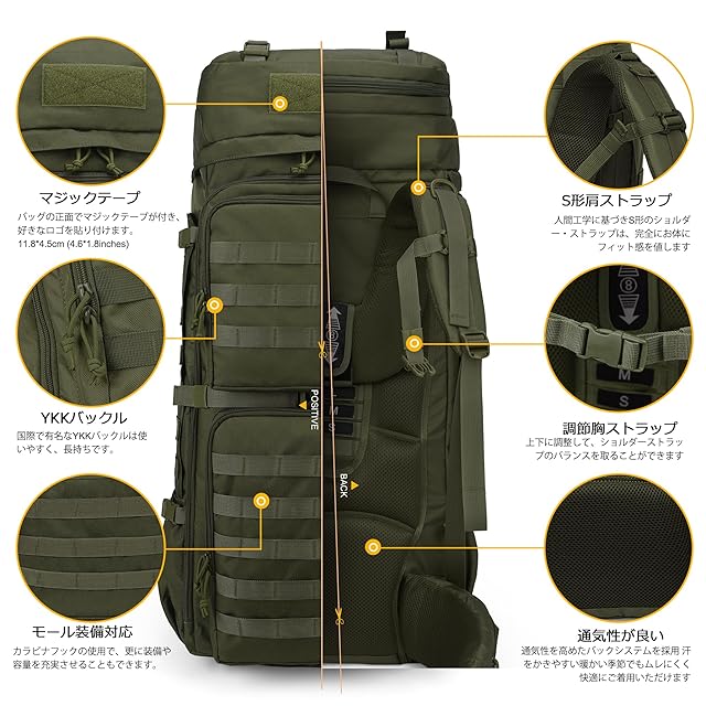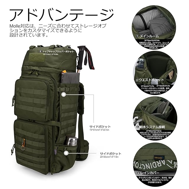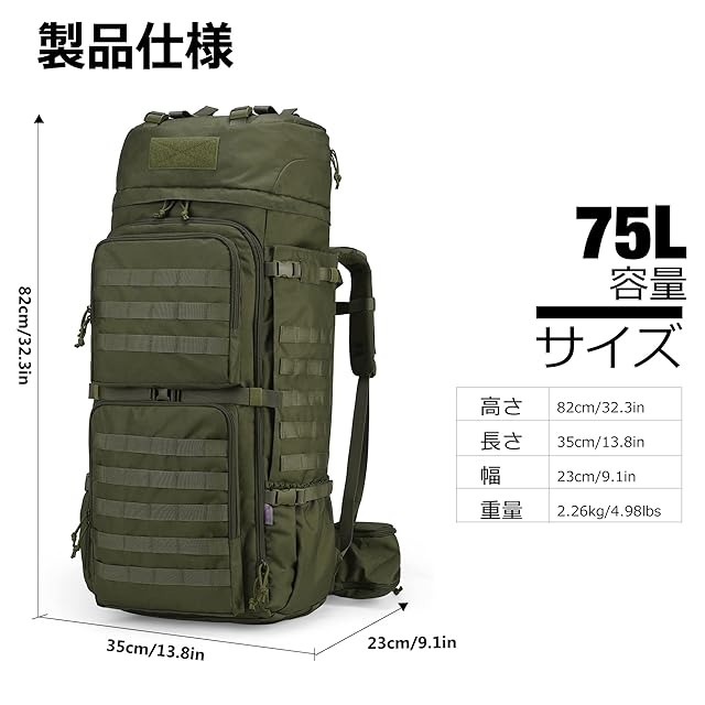 【バックパック仕様】容量:75リットル。長さ35x幅23x高さ82cm。このミリタリーバックパックは600D耐水性ポリエステルで作られています。 YKKジッパー。レインカバーが一枚付いています。