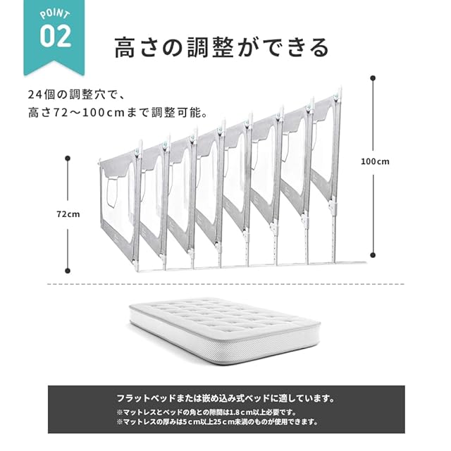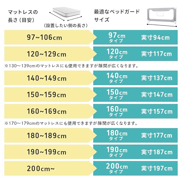 【選べる8サイズ】・ご使用のマットレスのサイズに応じたサイズを選べます。(97/120/140/150/160/180/190/200 cm)※ベッドガードのサイズは、マットレスの長さより大きいサイズを選ばないでください。※本製品は1面分のみの販売です。L字型・コの字型などでご使用する場合はサイズごとに必要な個数をお買い求めください。