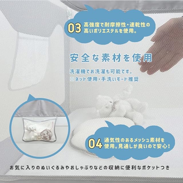 【安心・安全な素材】高強度で耐摩擦性・速乾性の高いポリエステルを使用。洗濯機の手洗いモードで洗濯可能なので、清潔にご使用いただけます。※ネットをご使用ください。メッシュ部分は通気性に優れ、見通しも良いため、お子様にとってはもちろん、おうちの方にとっても安心です。