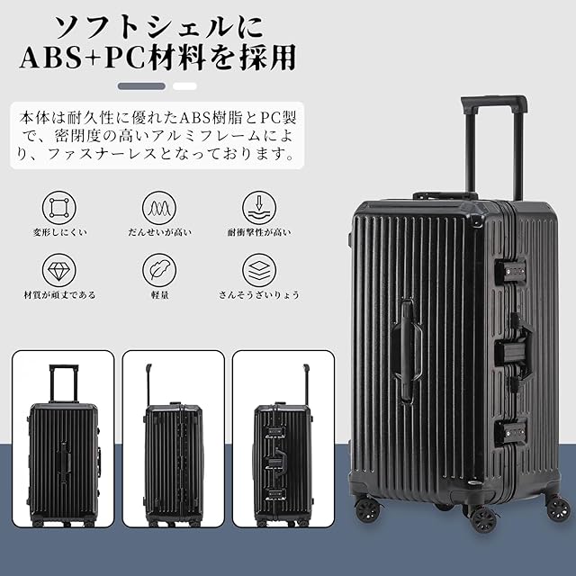 【材質&TSAダイヤル式ロック】スースケースはPC素材を採用し、耐衝撃性に優れた上、高弾性で、変形しにくい。エンボス加工、傷つきにくい。ABS素材より頑丈で耐久性に優れ、アルミフレームスーツケースより軽量で持ち歩きやすい。TSAダイヤル式ロックが搭載されて、外出がより安全。また、鍵穴は航空会社検査専用の物です。本製品に鍵は付属しておりません。
