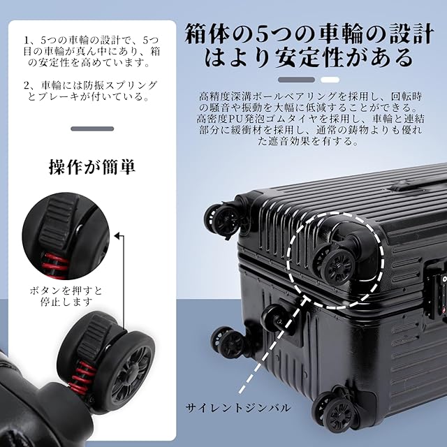 【灌注轮の型スーツケース】革新設計のキャスターシステム、二段階ショック吸収構造:第1段階:高弾性ゴムホイールによる初期衝撃緩和。 第2段階:特殊成型ホイール内蔵のサスペンションスプリングでさらなる振動低減。従来比150%の衝撃吸収性能を実現。プロ仕様の耐久設計, クロカン級ショックアブソーバーベアリング採用,同重量荷物でも30%軽い操作感。