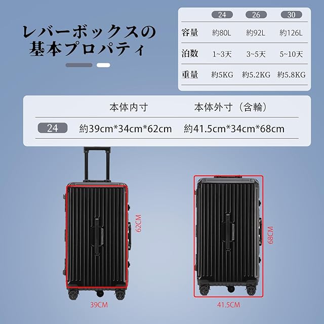 【スーツケースの仕様】キャスターを含めているサイズは以下です、24寸: 41.5cm*34cm*68cm。26寸: 41.5cm*35cm*73.5cm。30寸:45.5cm*37cm*85.5cm。キャスターを含めないサイズは以下です、24寸: 39cm*34cm*62cm,26寸: 39cm*35cm*67cm,30寸:43cm*37cm*78.5cm注意:手作業による測定のため、サイズは1~2cmの誤差がありますので、ご了承ください。