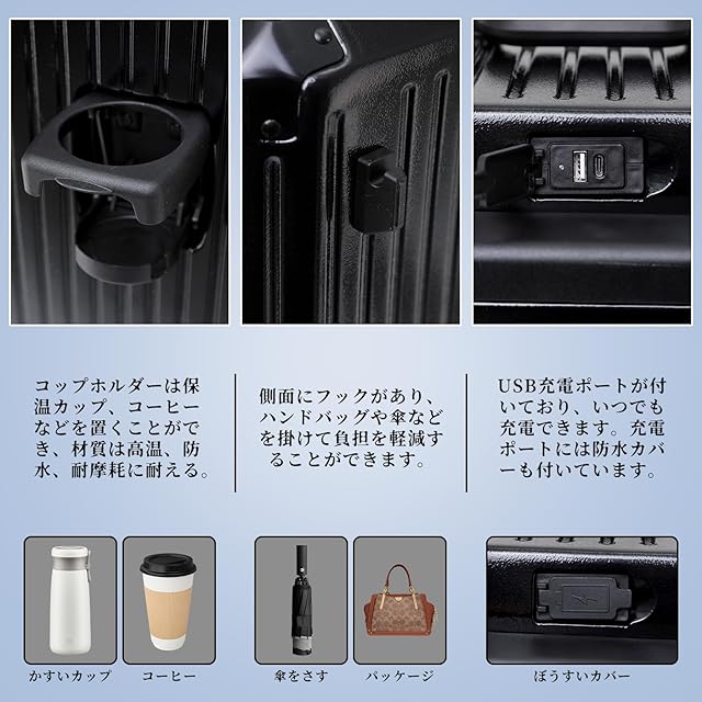 【カップホルダー+サイドフック】スーツケースの背面にカップホルダーがあり、飲み物、傘などの小物を簡単に取り出せる。折りたたみ可能なデザインは外観に影響を与えません。サイドにフックが付いているので、ハンドバッグやギフトバッグなどの荷物を掛けることができ、旅行時の負担を軽減します。