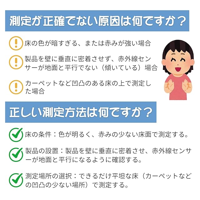 【赤外線測定】最新の赤外線技術を採用しており、超音波や手動での測定と比較して誤差が少なく、精度が高いです。環境の影響を受けにくく、どんな場所でも安定して測定できるため、室内外問わず正確なデータが得られます。