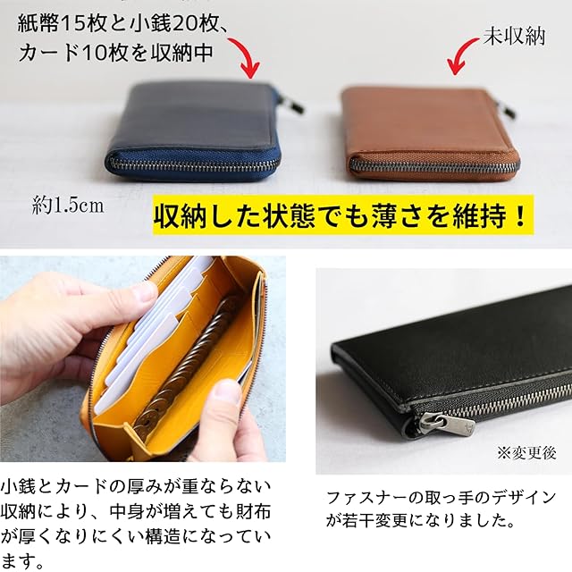 メインカードポケットの一番手前のポケットは、ファスナーとの干渉を考慮し、長めのポケット(2枚収納可)となっております。サブカードポケットは4~5枚収納可能です(個体差があり、革が馴染むまではキツく感じられる場合がございます)。