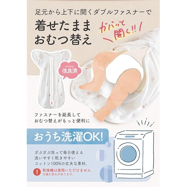 【ゆったり足回り+Wチャック採用】脚まわりはゆったり、さらにWチャックを採用しているのでスワドルをつけたまま、おむつ替えが出来ます♪また、上部チャック部分はカバー付きで、チャックによるケガを防ぎます。 手足も隠れて、全身を覆うので、お家の中でのお昼寝、パジャマ、旅行、お出掛け等様々なシーンで使えます。春秋冬の防寒はもちろん、夏場の冷房対策にもできます。オールシーズン対応!春、夏、秋、冬1年間通してご使用いただけます。