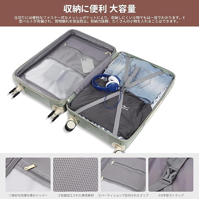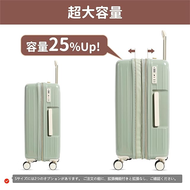 【大容量・拡張機能付き】マチ幅を5cm拡張するだけで容量が20%UPでき、他業者のスーツケースより多く収納できます。そのため荷物が増えても十分にご使用いただけます。ご注意:拡張機能後は機内持ち込み不可。