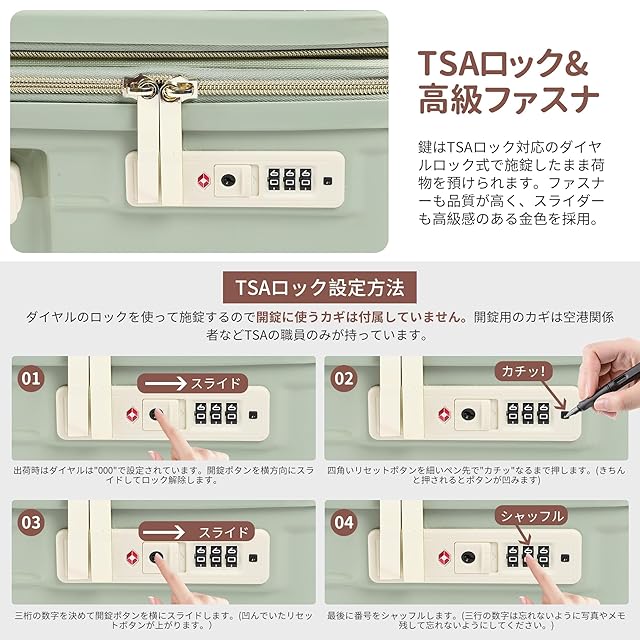 【TSAロック・360度回転静音キャスター】海外旅行には欠かせないTSAダイヤル方式のロックが搭載されており、外出がより安全になります。※鍵は航空会社検査専用のため本製品には付属しておりません。静穏、耐久性に優れた双輪キャスター、スムーズな滑りを実現しながら、360度の自由回転もできます。