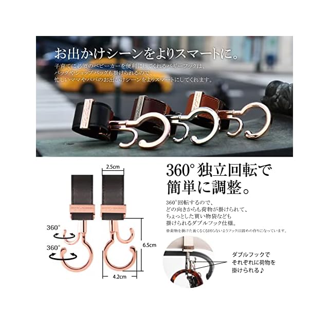 《360°回転式ダブルフック》「ママが使いやすい!」を形にした回転式フック。ベビーカー装着後でも好みに合わせて位置を調整できます。大小のフックは独立回転で、どちらのフックも360度回転。ダブルフック仕様で1つのフックに荷物を引っ掛けすぎて取り出し辛くなるストレスから解放してくれます。