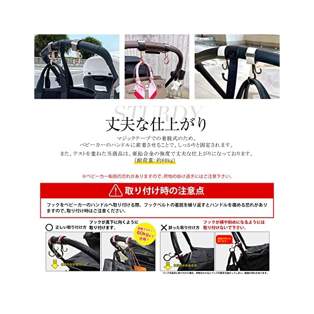 《安全設計》テストを重ねた当商品は亜鉛合金の強度で丈夫な仕上がりになっております。(耐荷重:1本あたり約60㎏)※ベビーカーの転倒の恐れがありますので、荷物のかけすぎにはご注意ください。