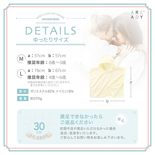 【吸水性、速乾性にすぐれたマイクロファイバー】 独自のマイクロファイバー素材で全身の水分を素早く吸収し、湯冷めの心配もなし。繰り返し洗ってもタオルのようにゴワつきません。速乾性もあるので雨の多い時期や天気の悪い日などにも便利です。●ARCADYはベビーの洋服や寝具用品に義務化されているホルムアルデヒドの検査実施済み。検査を受けない輸入製品が多い中、お子様の健康を第一に考えて厳しい検査をクリアしました。赤ちゃん も安心して使用していただけます。