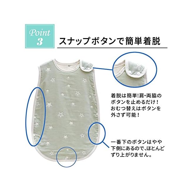 ✅【スナップボタン】マジックテープは赤ちゃんの肌を傷つける可能性があるため、着脱にはスナップボタンを採用しました。新生児の赤ちゃんには、スリーパーを床に引いた上に赤ちゃんを寝かせて簡単に着用。立てるようなっても上から被せて左右のボタンを止めるだけなので、着脱は簡単!パパママのストレスを減らします。※2020年10月から全カラーに股下のスナップボタンがつくように仕様変更しました!動きが大きいお子様も安心してご利用いただけます。