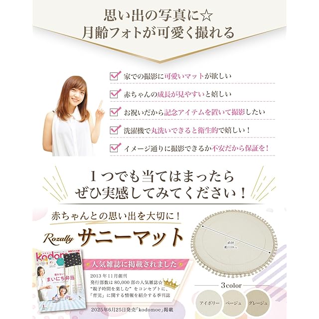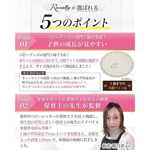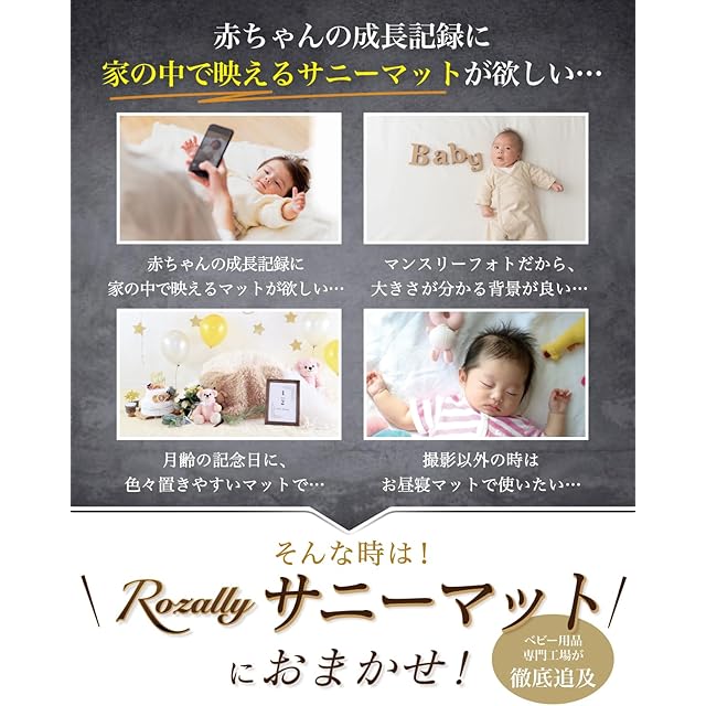 【保育士が監修】 Rozally サニーマット がついに正式販売開始。 「月齢フォトの映える背景に…」「ベビーマットとしてお昼寝に使いたい…」という お客様の声から生まれた 「記念撮影で大活躍」 の 洗える サニーマットです。 リビングに敷いて お昼寝マット や プレイマットとして使用できるのも人気の1つです。 「お七夜」「お宮参り」「初節句」「百日祝い」「お食い初め」「初誕生日」などの、 赤ちゃんの成長記録として記念写真に大人気のイブルマットとなっています。 「ごろ寝」している可愛い寝相を今話題のごろ寝アートとして、 記念写真に残しておくのも大切な思い出になります。 企画&設計では 新生児 や 乳幼児 など 赤ちゃん の育児に詳しい【保育士】の先生からアドバイスをもらい、衛生的に使えるよう丸洗い可能な素材選定を行いました。 シンプルで可愛いデザインに仕上げたため出産準備や出産祝いなどギフトにも最適になっています。