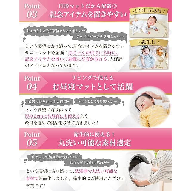 【こだわり】様々なメーカーから サニーマット や イブルマット として” ベビーマット ”が販売されていますが、Rozallyの サニーマット は”こだわり”が一味違います。赤ちゃん用品をメインに取り扱っている10社以上の工場からサンプルを取り寄せ、「快適な寝心地×映える円形マット」を一緒に試行錯誤して頂けた1社に絞って発注を行なっています。