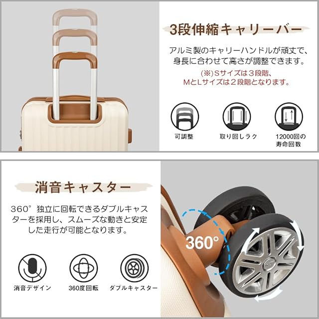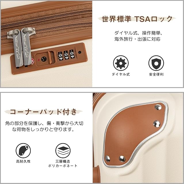 【高品質なボディ&信頼のYKKファスナー】ABS樹脂は軽くて弾力性と割れに強く、PC(ポリカーボネート)樹脂は耐衝撃性・断熱材に優れる、両素材を混合した耐久性が高いハードタイプの高品質ボディを実現しています。また、日本が世界に誇るYKKファスナーをメインファスナーに標準装備。ファスナータイプのスーツケースによくあるファスナーの不具合(ファスナー脱線や開き)を解消し、長期にわたり安定した使用感が可能となりました。