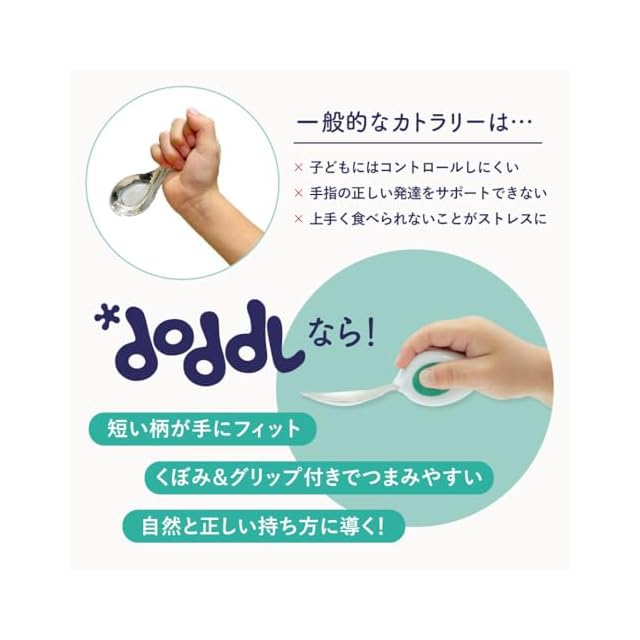 ✅【”じぶんで食べる”はメリットたくさん!】doddl(ドードル)のスプーンとフォークは赤ちゃんが使いやすく、指を添えるだけで正しいスプーンの持ち方ができるデザイン設計。持ち手の形や長さにもこだわり赤ちゃんが「じぶんで食べる」楽しみを発見しながら食育を学べる理想的なスプーンフォークセットです。じぶんで食べる事は、手先の操作技術の向上はもちろん、自立心の育成だけでなく、食に対する興味が高まることで偏食軽減、食べすぎ防止など将来の食に関わる問題への対策にもなるんです♪食育の観点からも「じぶんで食べる」離乳食を始めるならdodleのスプーンとフォークセットがおすすめです!