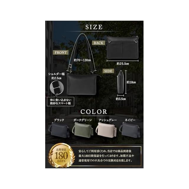 【スッキリ見えるスマートなシルエット】底マチを3.5cmに設定。収納力も確保しながらふくらみを抑える薄型設計。財布やスマホ、その他の小物をいれすぎで膨らんでしまってもそのまま膨らんでしまっては見栄えが悪いですが、薄型設計でスマートに使用できます。