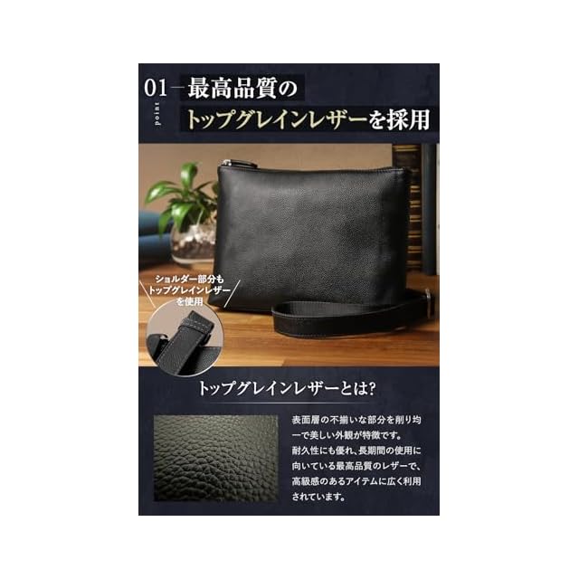 【最高品質のトップグレインレザーを採用】表層面の不揃いな部分をカットし、均一で美しい外観が特徴です。耐久性にも優れ、長期間の使用にも向いている最高品質のレザーで高級感のあるアイテムに広く使用されています。バッグ本体だけでなく、ショルダーにも本革(トップグレインレザー)を使用しています。