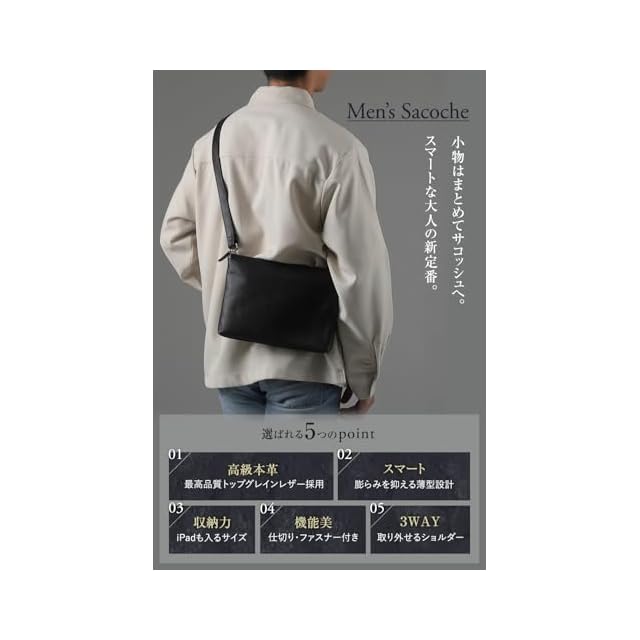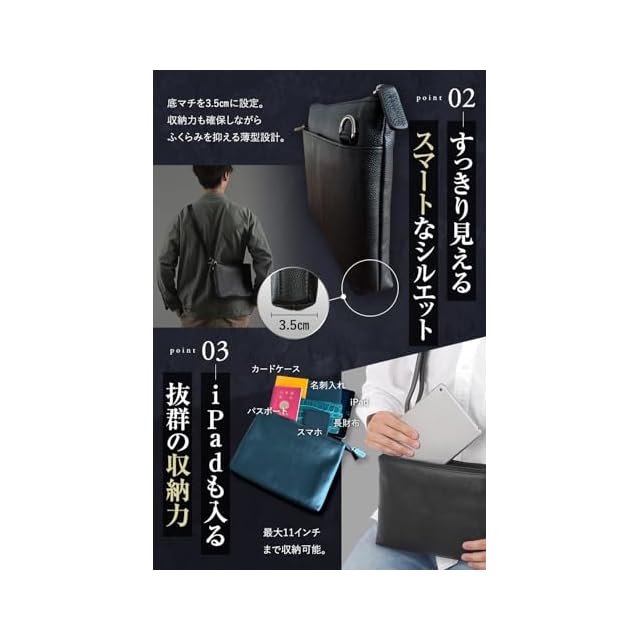 【iPadも入る抜群の収納力】iPadは11インチまで収納できます。iPadを入れても財布、スマホ、名刺入れやカードケースも収納できる収納力があります。