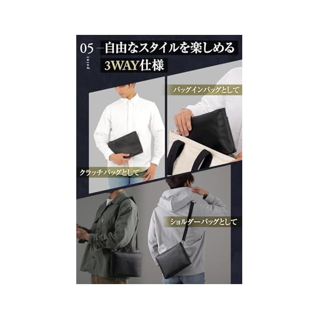 【自由なスタイルを楽しめる3WAY仕様】ショルダーベルトは取り外しができるので、クラッチバッグ、バッグインバッグとして、ショルダーベルトを使えばショルダーバッグとして利用できる3WAY仕様です。