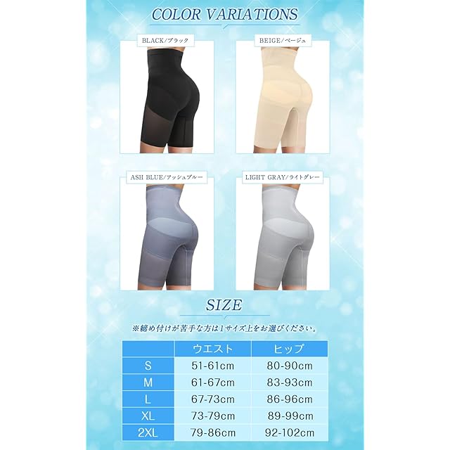 [サイズ] S: ウエスト 55-61cm、ヒップ 80-90cm M: ウエスト 61-67cm、ヒップ 83-93cm L: ウエスト 67-73cm、ヒップ 86-96cm、XL: ウエスト 73-79cm、ヒップ 89-99cm、2XL: ウエスト 79-86cm、ヒップ 92-102cm
