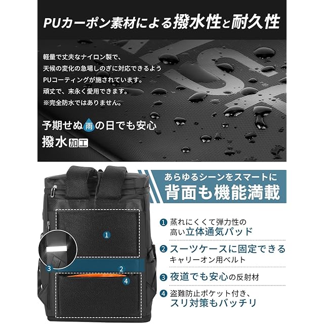 【BOX構造・キャリーオン機能】バックパックは、美しさと機能性を兼ね備えた今人気のBOX構造、スクエア型です。スキーヤーやキャンパー、アウトドア愛好家にも愛用されています。ビジネスリュックはキャリーオン機能搭載し、キャリーケースのハンドルに取り付け可能!