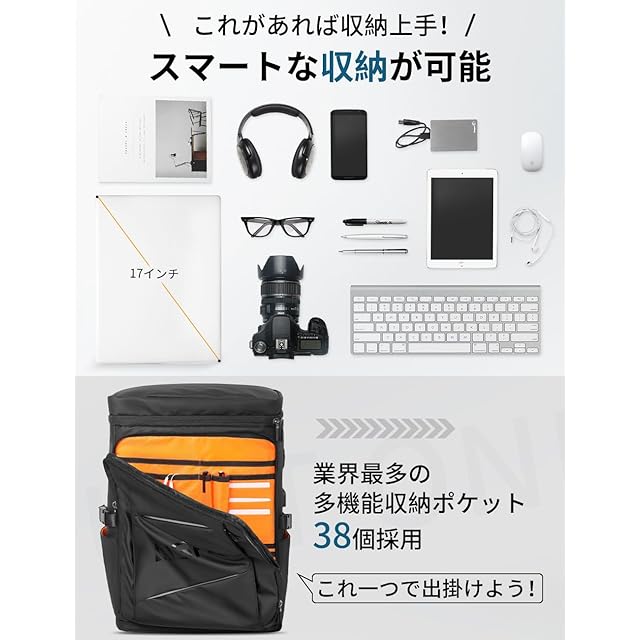 【誰でも収納上手になる複数ポケット】圧倒的な収納力!業界最多の多機能収納ポケット19個採用!荷物の仕分けに便利な、多様なポケットをたっぷり詰め込みました。17インチのノートPC収納可。