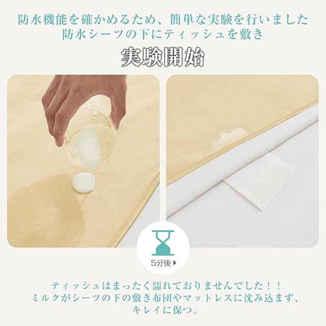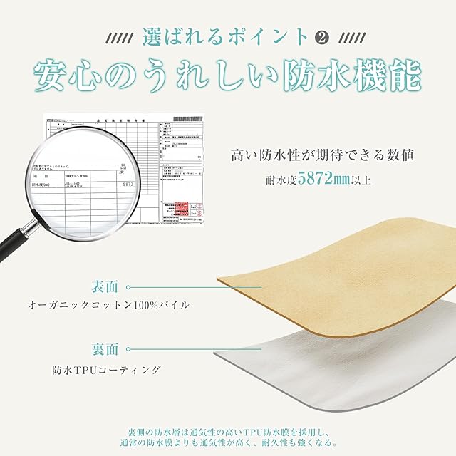 【しっかり防水】高品質のポリウレタンコーティングが液体の浸透を効果的に防ぎます。ベッドマットレスや布団を液体のしみや湿気から守ります。耐水性は国内試験所で検査済み。耐水度5872を取得、他の介護用防水シーツやおねしょシーツを圧倒する耐水性があり、朝までお布団をしっかりガード!