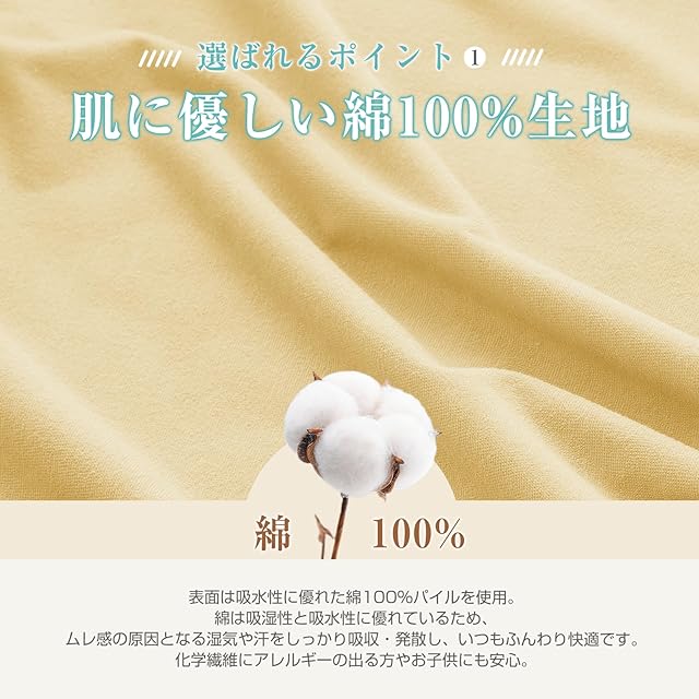 【綿100%天然素材】防水シーツの表面は高品質の綿パイルを採用。パイル生地がしっかりと汗や水分を吸収してくれるので汗っかきな赤ちゃんでも安心。普通のコットン生地より吸湿性や速乾性が優れており、素肌に触れても心地いい人気のある素材です。